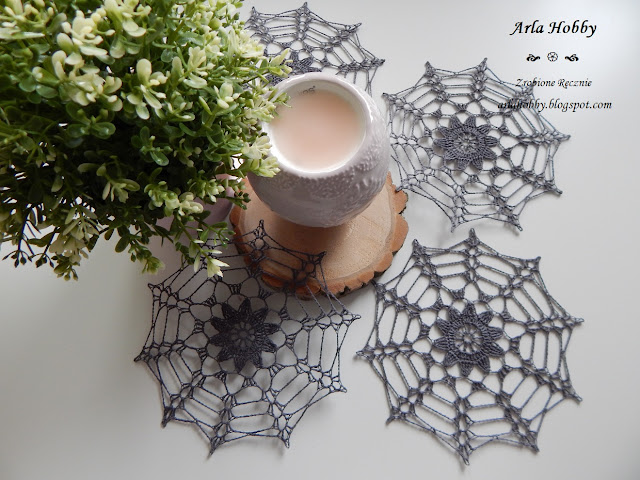 Koleżanka poprosiła mnie o delikatne serwetki pod filiżankę. Miały być szare i ażurowe. Wybrałam nitkę o nazwie Snehurka i szydełko Tulip nr 1,5 mm. Robiło się je bardzo przyjemnie i szybko. To był odpoczynek od szydełkowania kaptura z wełny. Już niedługo go pokażę.
